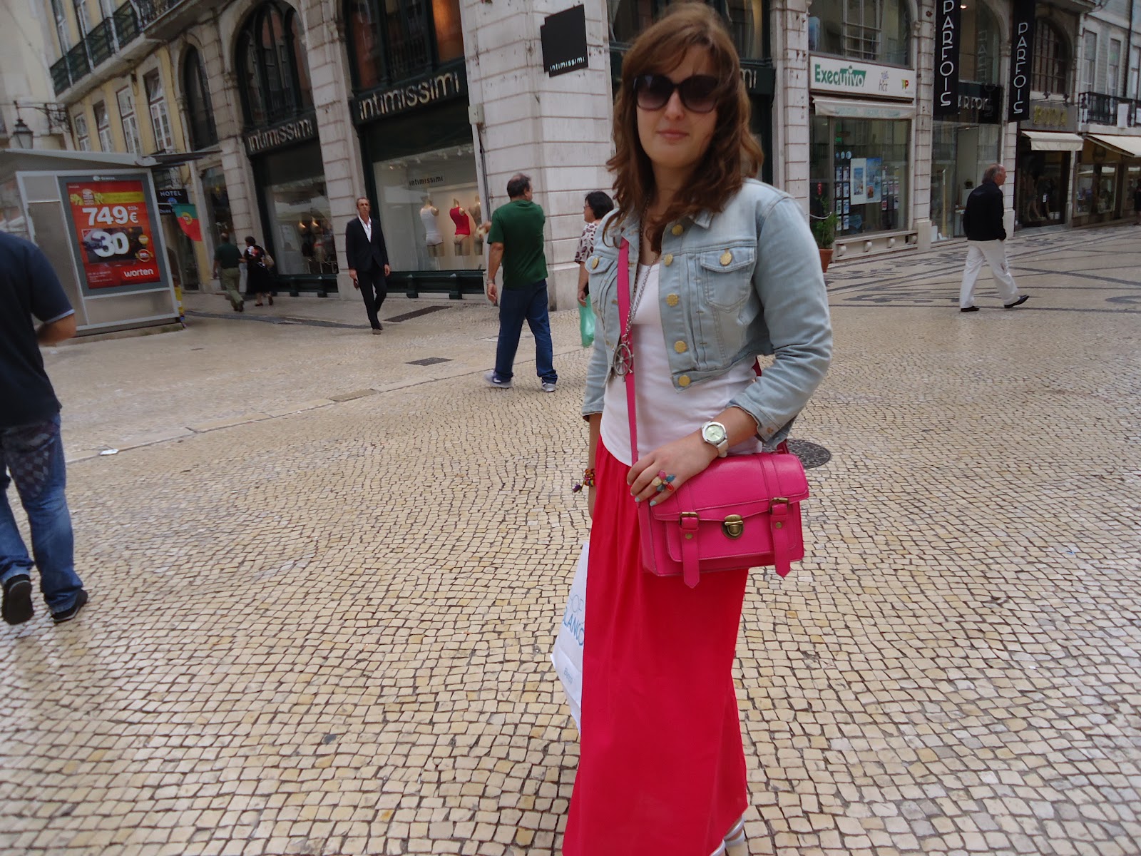 Este foi o meu look de hoje, uma saia comprida cor de rosa, é super confortável!! Aproveitei hoje para estrear as minhas havaianas. Utilizei também a minha casaca de ganga nova, ideal para o Verão, um top básico branco e muitos acessórios!!
